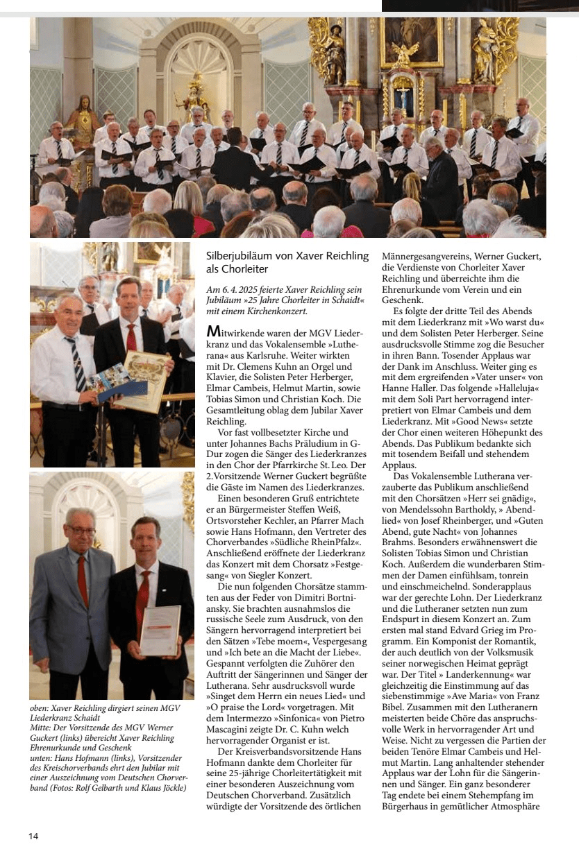 Xaver Reichling, der momentan noch zwei weitere Chöre, nämlich Hatzenbühl und Essingen dirigiert, arbeitet sehr gut mit dem Vorstandsteam des Liederkranz Schaidt zusammen und bittet seine Sänger stets um regen Singstundenbesuch.
